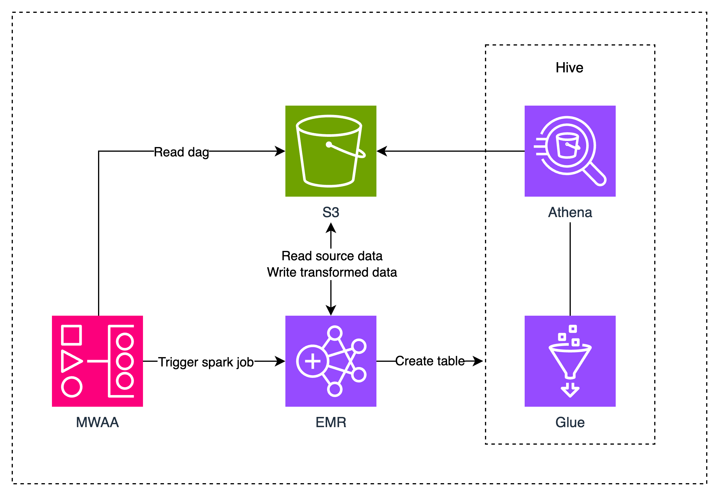 - 数据分析:是大数据的应用部分,最直接的方法就是使用 Hive 以 SQL 的方式对数据进行查询分析,AWS中对应的服务是Athena。