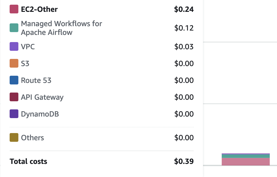 值得一提的是本次 Demo 的花费,得益于 AWS EMR Serverless 的低成本,本次演示的花费仅为0.39$,MWAA 的花费是根据时长收费的,所以不使用的时候最好删掉。